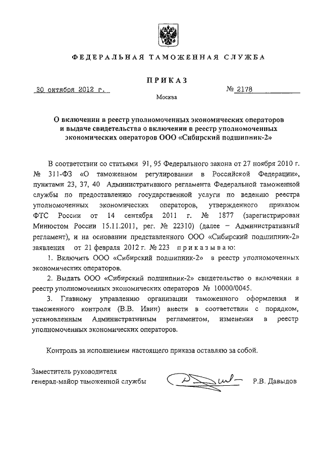 "О ВКЛЮЧЕНИИ В РЕЕСТР УПОЛНОМОЧЕННЫХ ЭКОНОМИЧЕСКИХ ОПЕРАТОРОВ И ВЫДАЧЕ СВИДЕТЕЛЬСТВА О ВКЛЮЧЕНИИ В РЕЕСТР УПОЛНОМОЧЕННЫХ ЭКОНОМИЧЕСКИХ ОПЕРАТОРОВ ООО "СИБИРСКИЙ ПОДШИПНИК - 2"
