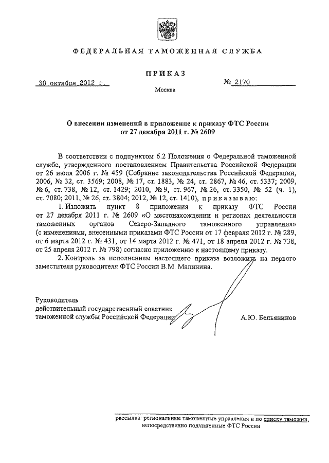 ПРИКАЗ ФТС РФ от 30.10.2012 N 2170