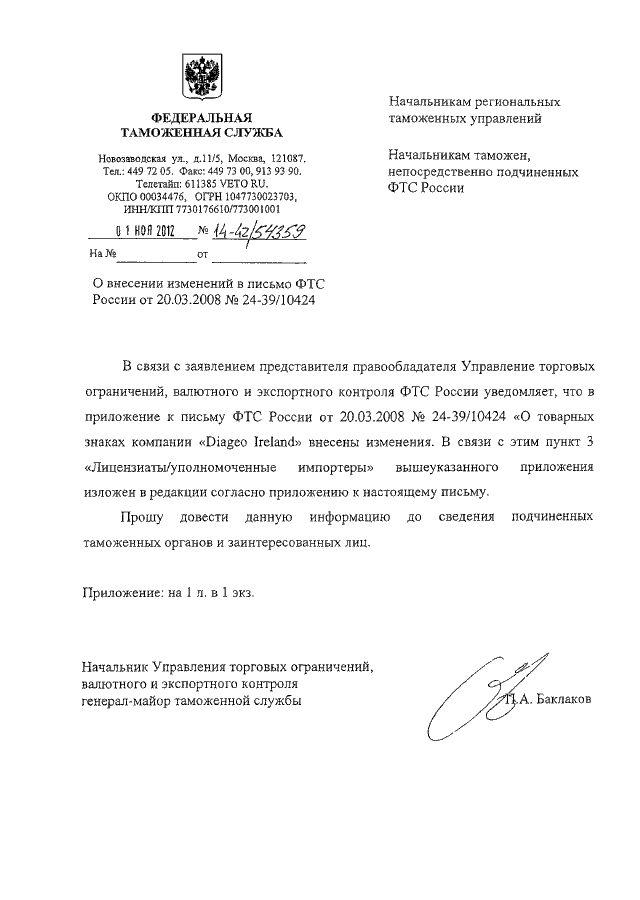 "О ВНЕСЕНИИ ИЗМЕНЕНИЙ В ПИСЬМО ФТС РОССИИ ОТ 20.03.2008 N 24-39/10424"