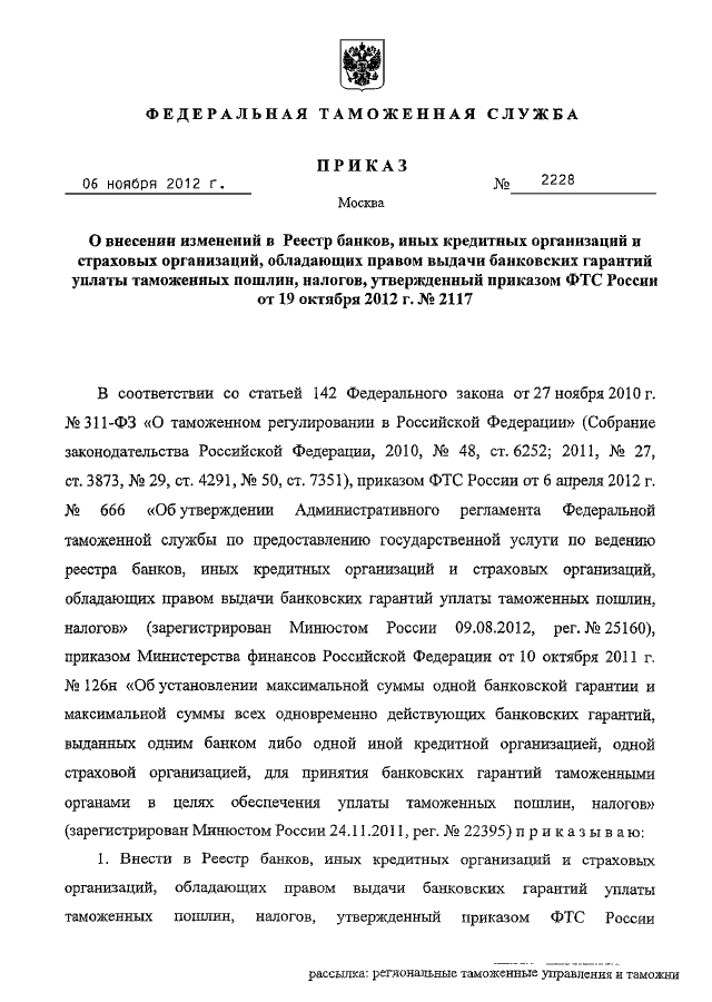 ПРИКАЗ ФТС РФ от 06.11.2012 N 2228 "О ВНЕСЕНИИ ИЗМЕНЕНИЙ В РЕЕСТР БАНКОВ, ИНЫХ КРЕДИТНЫХ ОРГАНИЗАЦИЙ