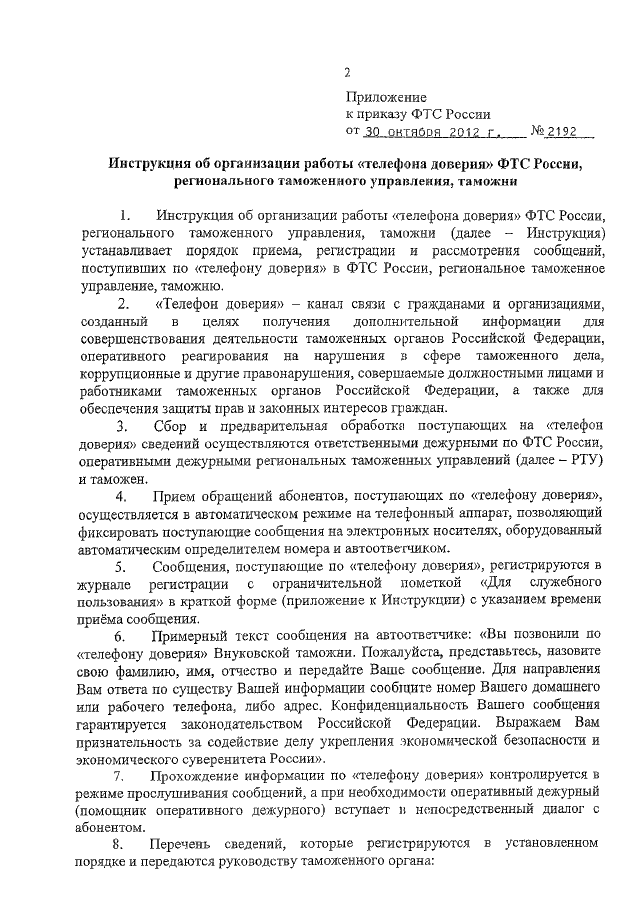 ПРИКАЗ ФТС РФ от 30.10.2012 N 2192