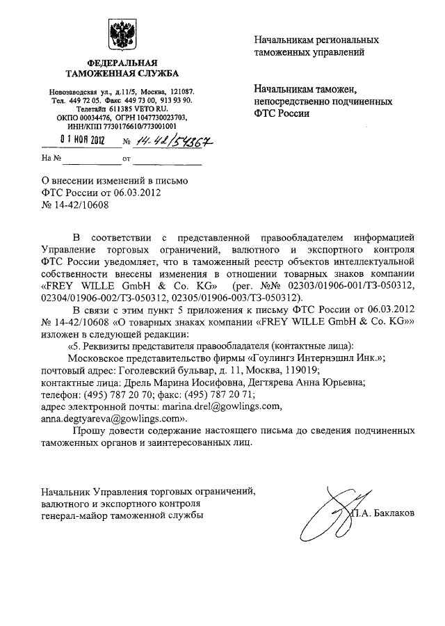 "О ВНЕСЕНИИ ИЗМЕНЕНИЙ В ПИСЬМО ФТС РОССИИ ОТ 06.03.2012 N 14-42/10608"