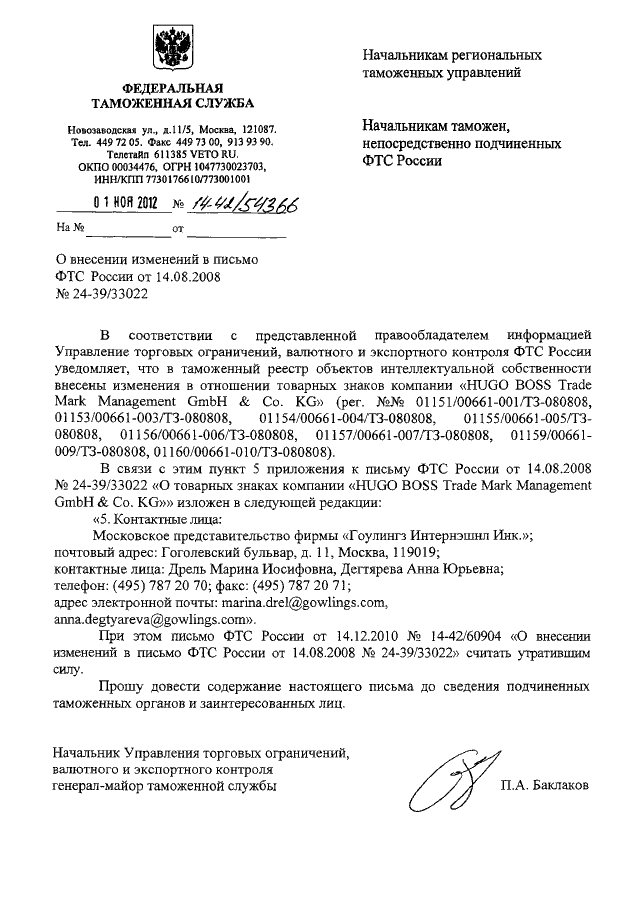 ПИСЬМО ФТС РФ от 01.11.2012 N 14-42/54366