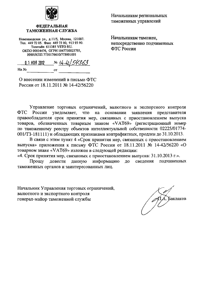 "О ВНЕСЕНИИ ИЗМЕНЕНИЙ В ПИСЬМО ФТС РОССИИ ОТ 18.11.2011 N 14-42/56220"