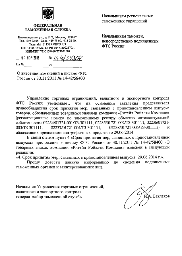ПИСЬМО ФТС РФ от 01.11.2012 N 14-42/54364