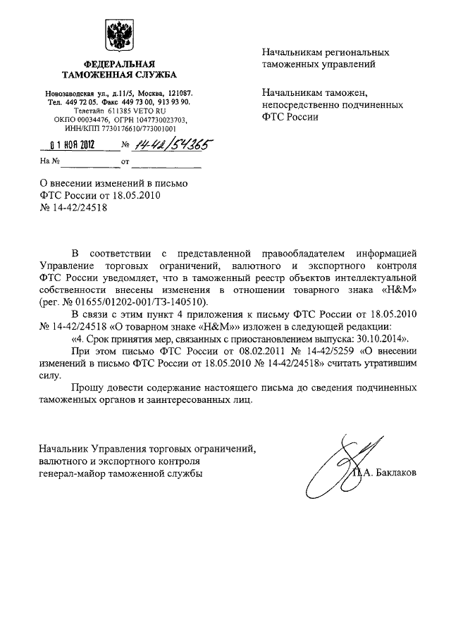 "О ВНЕСЕНИИ ИЗМЕНЕНИЙ В ПИСЬМО ФТС РОССИИ ОТ 18.05.2010 N 14-42/24518"