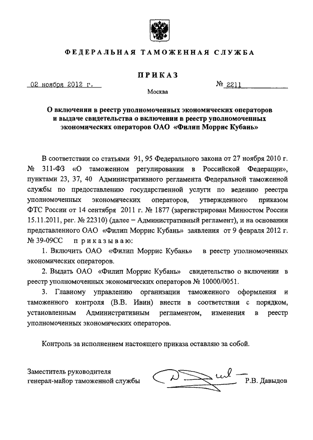 "О ВКЛЮЧЕНИИ В РЕЕСТР УПОЛНОМОЧЕННЫХ ЭКОНОМИЧЕСКИХ ОПЕРАТОРОВ И ВЫДАЧЕ СВИДЕТЕЛЬСТВА О ВКЛЮЧЕНИИ В РЕЕСТР УПОЛНОМОЧЕННЫХ ЭКОНОМИЧЕСКИХ ОПЕРАТОРОВ ОАО "ФИЛИП МОРРИС КУБАНЬ"