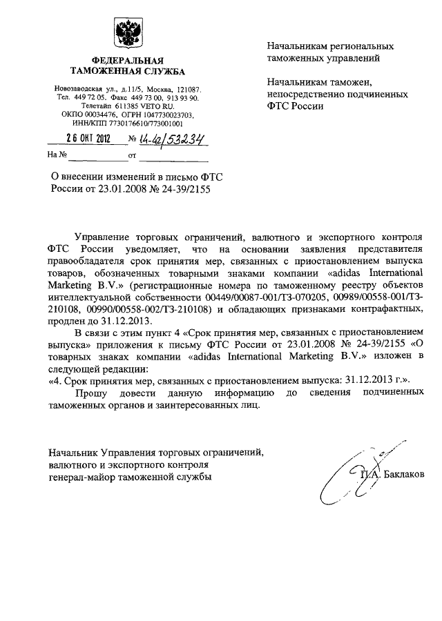 "О ВНЕСЕНИИ ИЗМЕНЕНИЙ В ПИСЬМО ФТС РОССИИ ОТ 23.01.2008 N 24-39/2155"