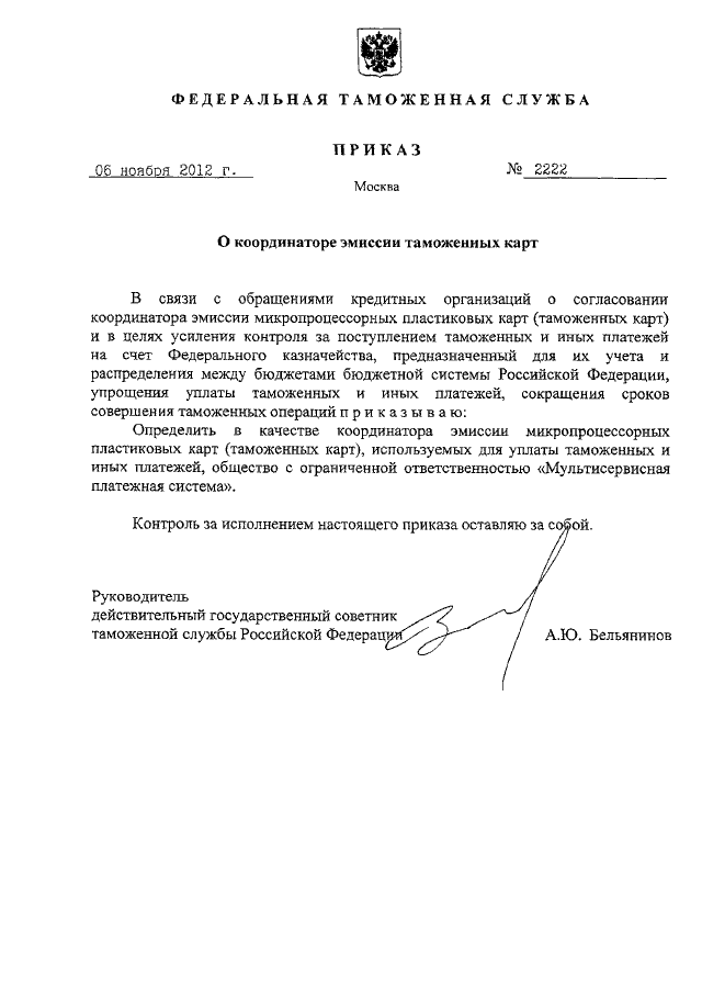 ПРИКАЗ ФТС РФ от 06.11.2012 N 2222