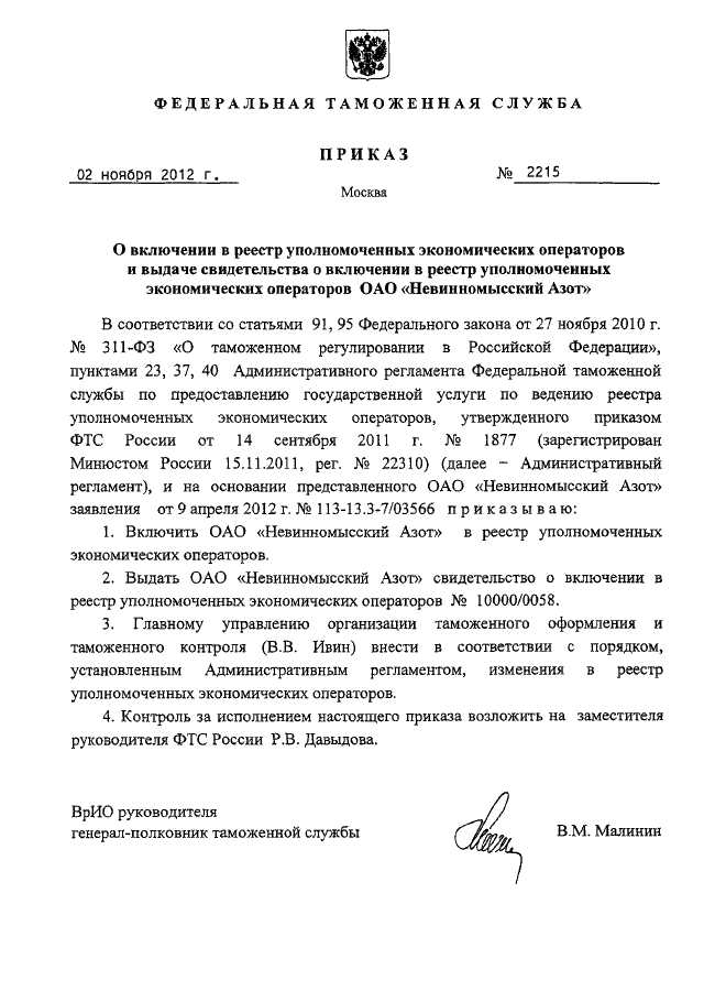 "О ВКЛЮЧЕНИИ В РЕЕСТР УПОЛНОМОЧЕННЫХ ЭКОНОМИЧЕСКИХ ОПЕРАТОРОВ И ВЫДАЧЕ СВИДЕТЕЛЬСТВА О ВКЛЮЧЕНИИ В РЕЕСТР УПОЛНОМОЧЕННЫХ ЭКОНОМИЧЕСКИХ ОПЕРАТОРОВ ОАО "НЕВИННОМЫССКИЙ АЗОТ"
