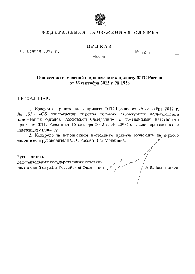 ПРИКАЗ ФТС РФ от 06.11.2012 N 2219