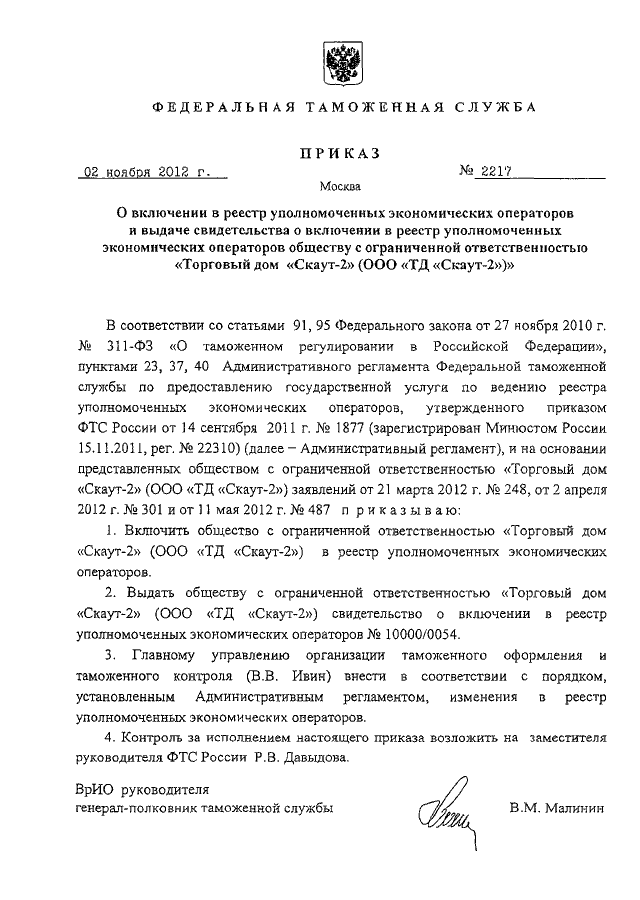 ПРИКАЗ ФТС РФ от 02.11.2012 N 2217 "О ВКЛЮЧЕНИИ В РЕЕСТР УПОЛНОМОЧЕННЫХ ЭКОНОМИЧЕСКИХ ОПЕРАТОРОВ И