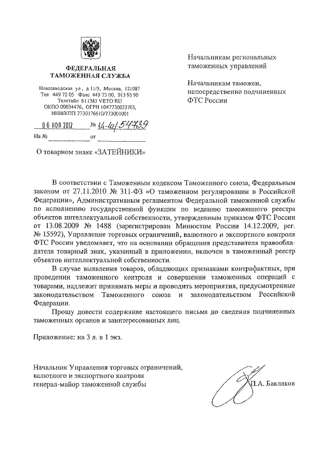 ПИСЬМО ФТС РФ от 06.11.2012 N 14-42/54739