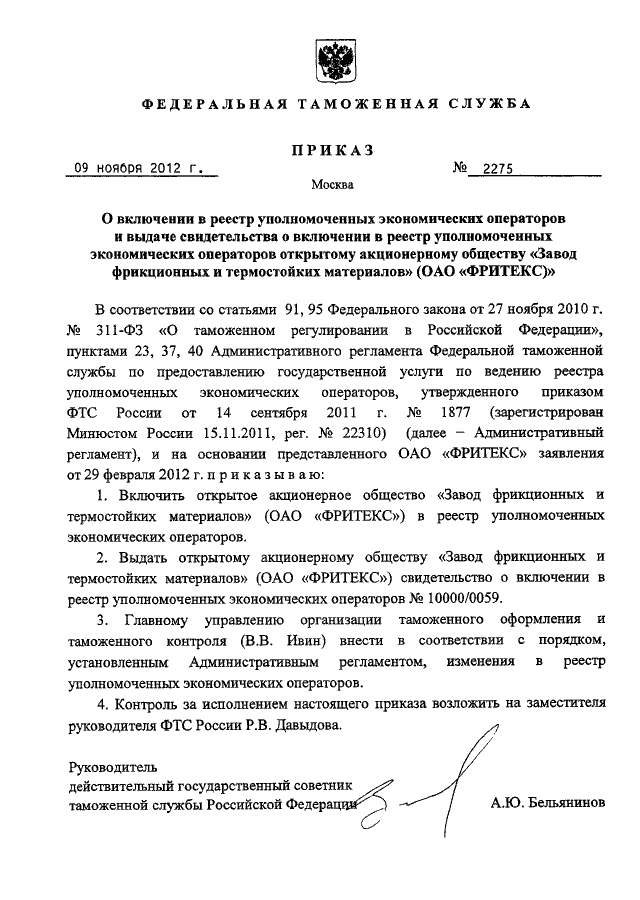 ПРИКАЗ ФТС РФ от 09.11.2012 N 2275 "О ВКЛЮЧЕНИИ В РЕЕСТР УПОЛНОМОЧЕННЫХ ЭКОНОМИЧЕСКИХ ОПЕРАТОРОВ И