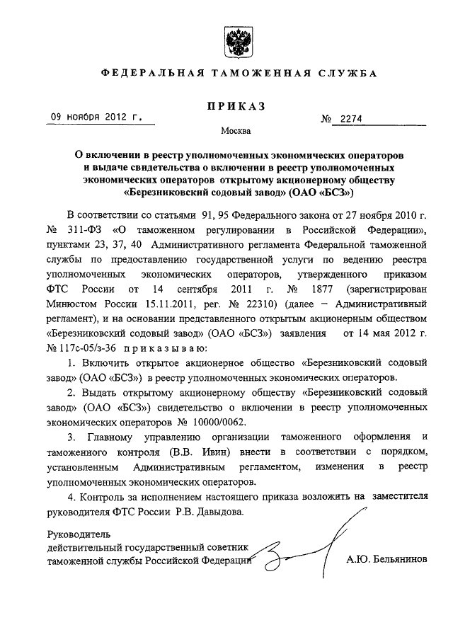ПРИКАЗ ФТС РФ от 09.11.2012 N 2274 "О ВКЛЮЧЕНИИ В РЕЕСТР УПОЛНОМОЧЕННЫХ ЭКОНОМИЧЕСКИХ ОПЕРАТОРОВ И
