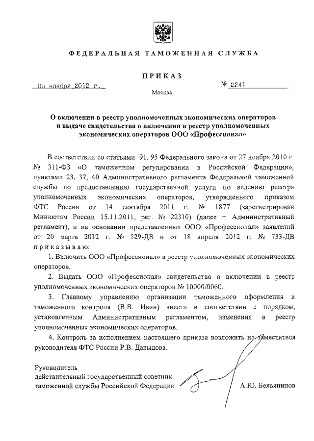"О ВКЛЮЧЕНИИ В РЕЕСТР УПОЛНОМОЧЕННЫХ ЭКОНОМИЧЕСКИХ ОПЕРАТОРОВ И ВЫДАЧЕ СВИДЕТЕЛЬСТВА О ВКЛЮЧЕНИИ В РЕЕСТР УПОЛНОМОЧЕННЫХ ЭКОНОМИЧЕСКИХ ОПЕРАТОРОВ ООО "ПРОФЕССИОНАЛ"