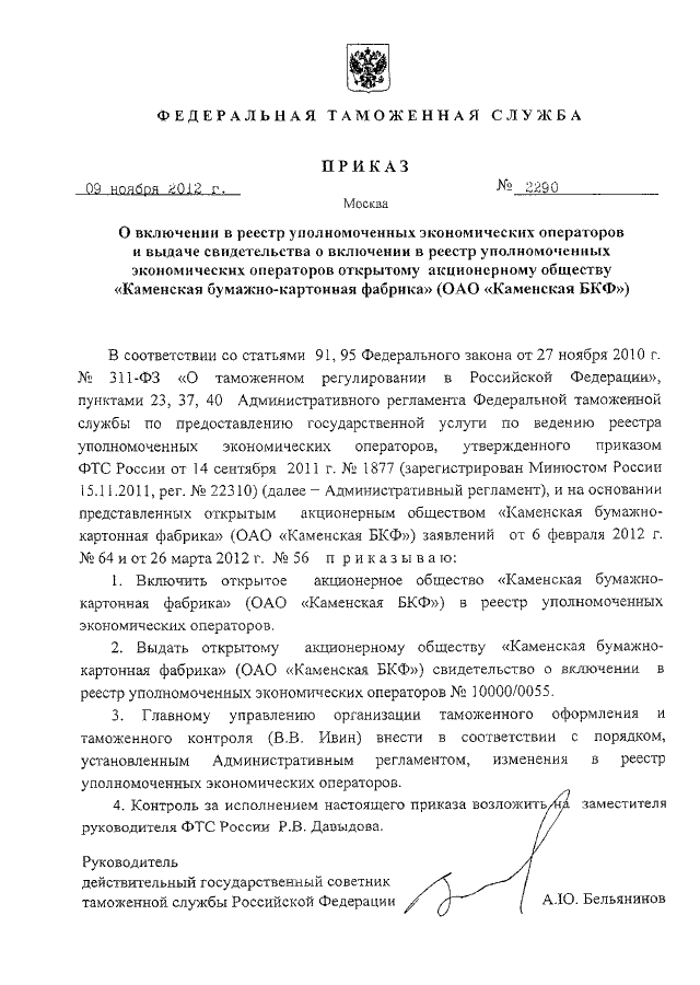 ПРИКАЗ ФТС РФ от 09.11.2012 N 2290 "О ВКЛЮЧЕНИИ В РЕЕСТР УПОЛНОМОЧЕННЫХ ЭКОНОМИЧЕСКИХ ОПЕРАТОРОВ И
