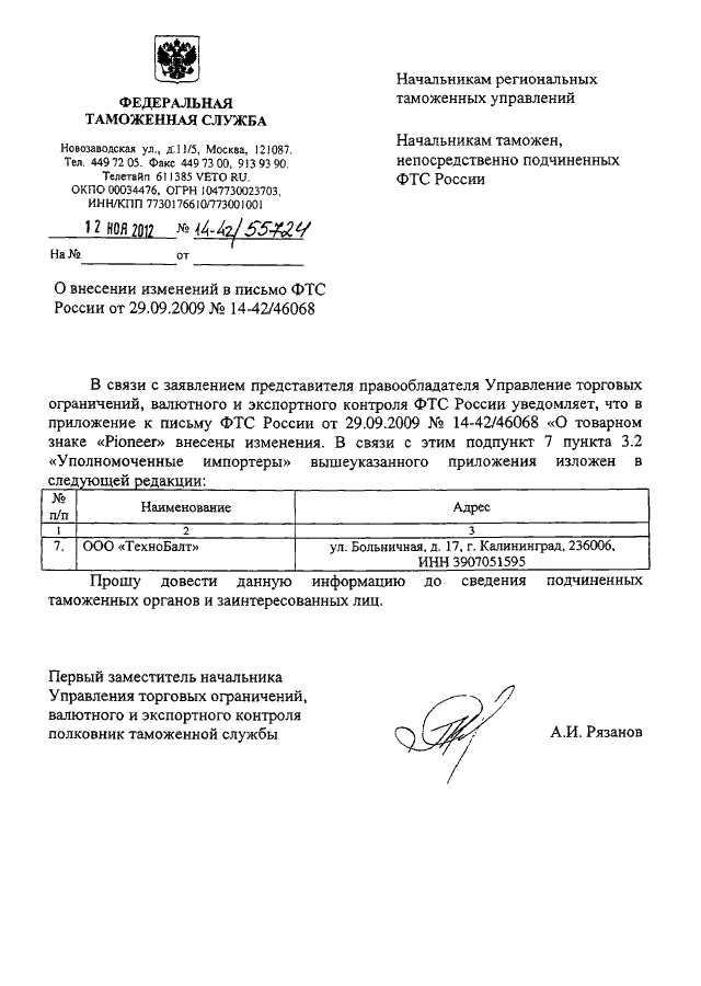 "О ВНЕСЕНИИ ИЗМЕНЕНИЙ В ПИСЬМО ФТС РОССИИ ОТ 29.09.2009 N 14-42/46068"