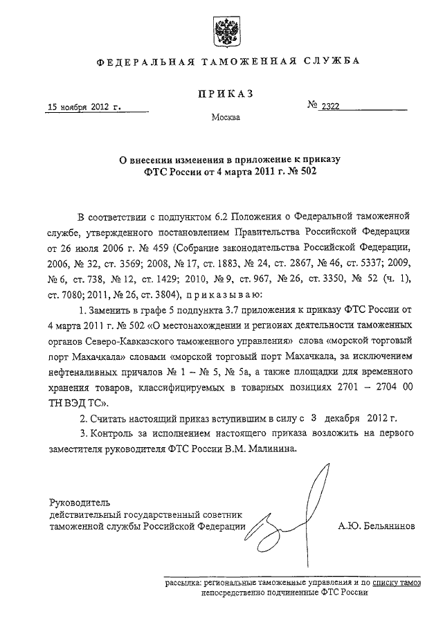 ПРИКАЗ ФТС РФ от 15.11.2012 N 2322