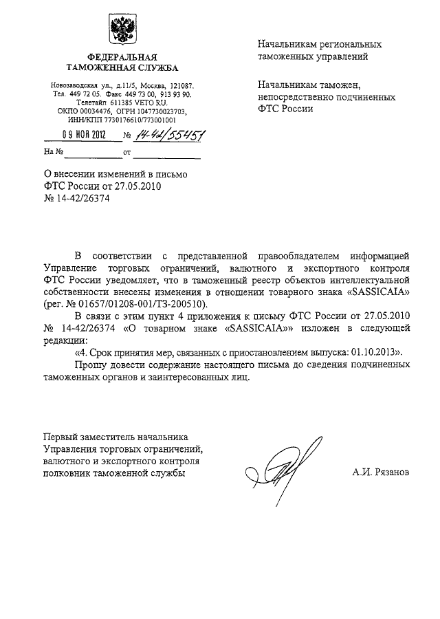 ПИСЬМО ФТС РФ от 09.11.2012 N 14-42/55451