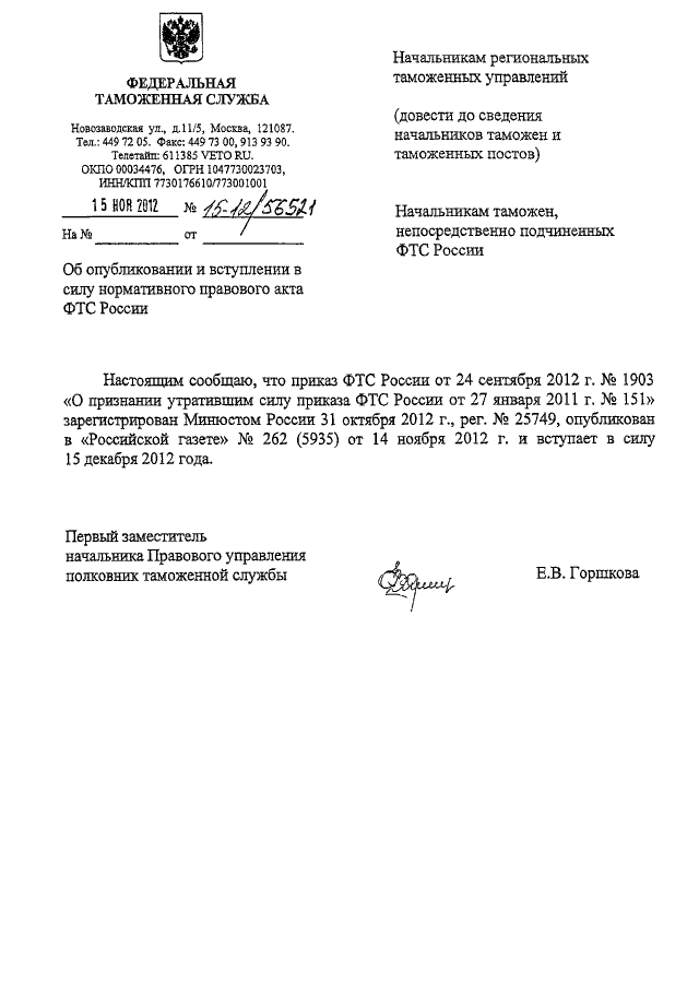 "ОБ ОПУБЛИКОВАНИИ И ВСТУПЛЕНИИ В СИЛУ НОРМАТИВНОГО ПРАВОВОГО АКТА ФТС РОССИИ"