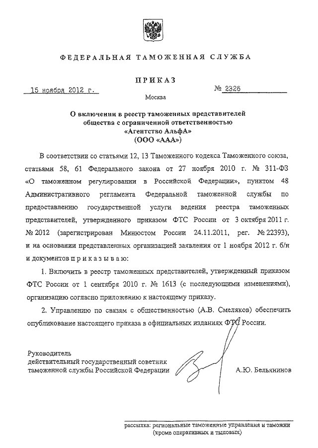 "О ВКЛЮЧЕНИИ В РЕЕСТР ТАМОЖЕННЫХ ПРЕДСТАВИТЕЛЕЙ ОБЩЕСТВА С ОГРАНИЧЕННОЙ ОТВЕТСТВЕННОСТЬЮ "АГЕНТСТВО АЛЬФА" (ООО "ААА")"