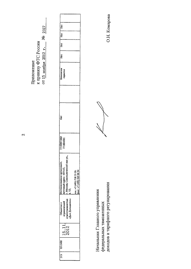 ПРИКАЗ ФТС РФ от 15.11.2012 N 2327
