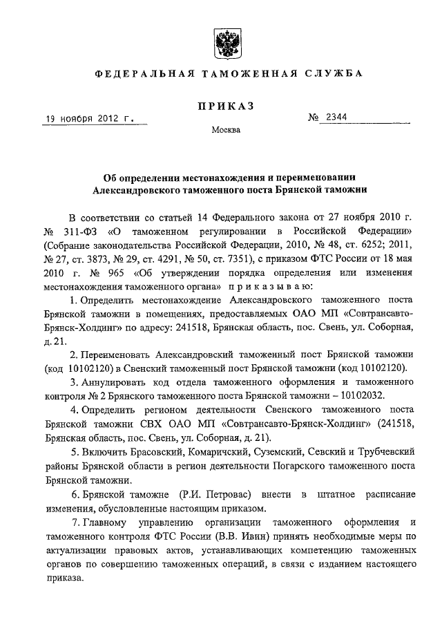 ПРИКАЗ ФТС РФ от 19.11.2012 N 2344
