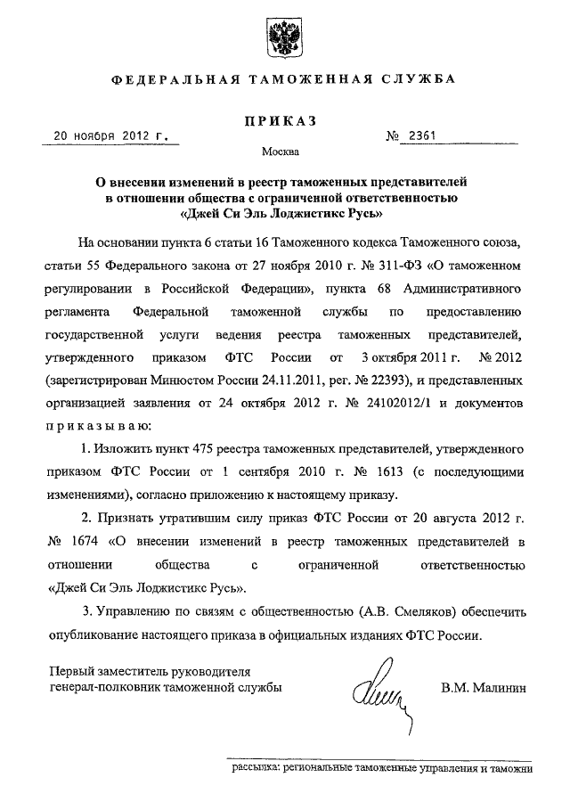 ПРИКАЗ ФТС РФ от 20.11.2012 N 2361