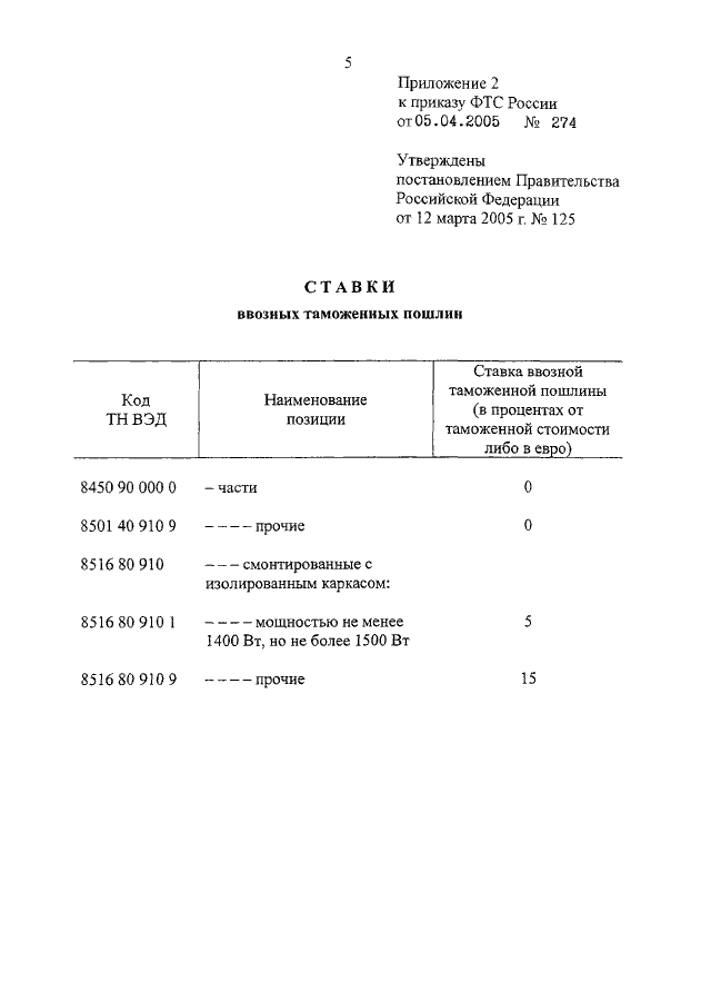 ПРИКАЗ ФТС РФ от 05.04.2005 N 274