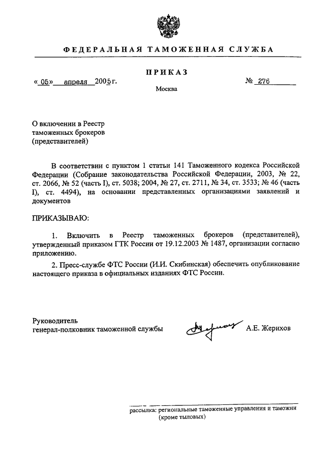 ПРИКАЗ ФТС РФ от 05.04.2005 N 276