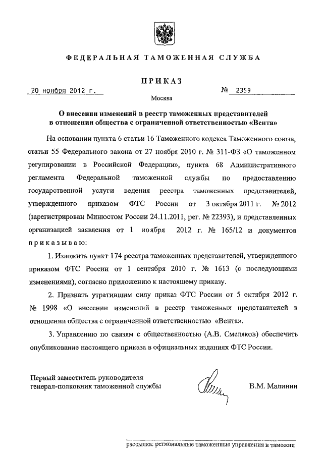 ПРИКАЗ ФТС РФ от 20.11.2012 N 2359