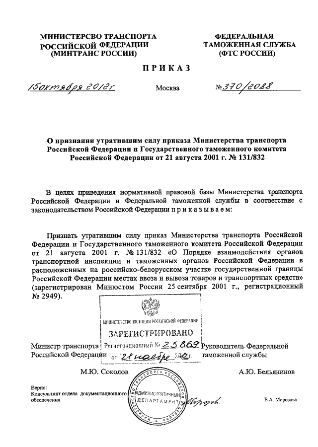 ПРИКАЗ Минтранса РФ N 370, ФТС РФ N 2088 от 15.10.2012 "О ПРИЗНАНИИ УТРАТИВШИМ СИЛУ ПРИКАЗА МИНИСТЕРСТВА ТРАНСПОРТА