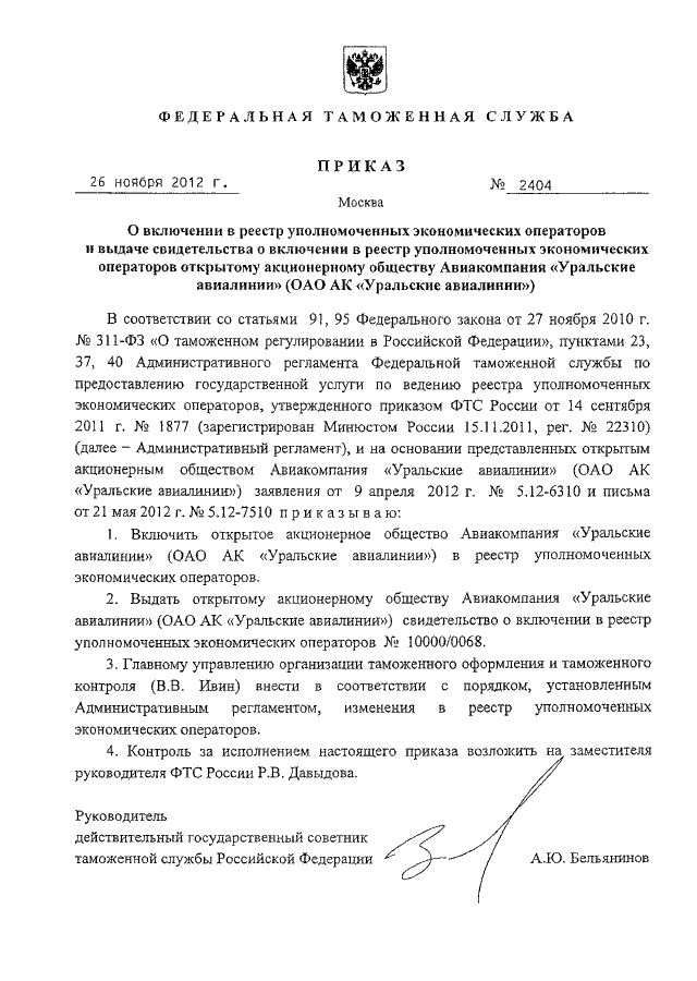ПРИКАЗ ФТС РФ от 26.11.2012 N 2404 "О ВКЛЮЧЕНИИ В РЕЕСТР УПОЛНОМОЧЕННЫХ ЭКОНОМИЧЕСКИХ ОПЕРАТОРОВ И