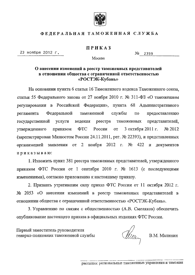 ПРИКАЗ ФТС РФ от 23.11.2012 N 2399