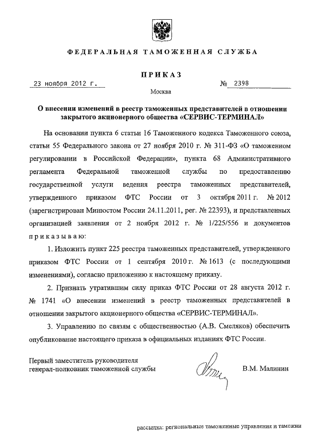 ПРИКАЗ ФТС РФ от 23.11.2012 N 2398