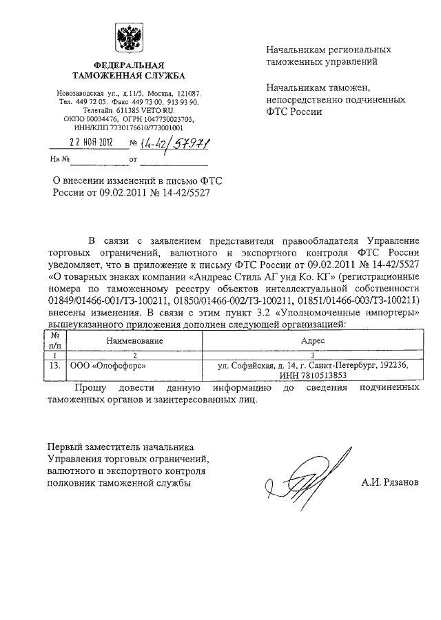 ПИСЬМО ФТС РФ от 22.11.2012 N 14-42/57971