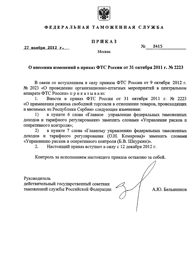 ПРИКАЗ ФТС РФ от 27.11.2012 N 2415