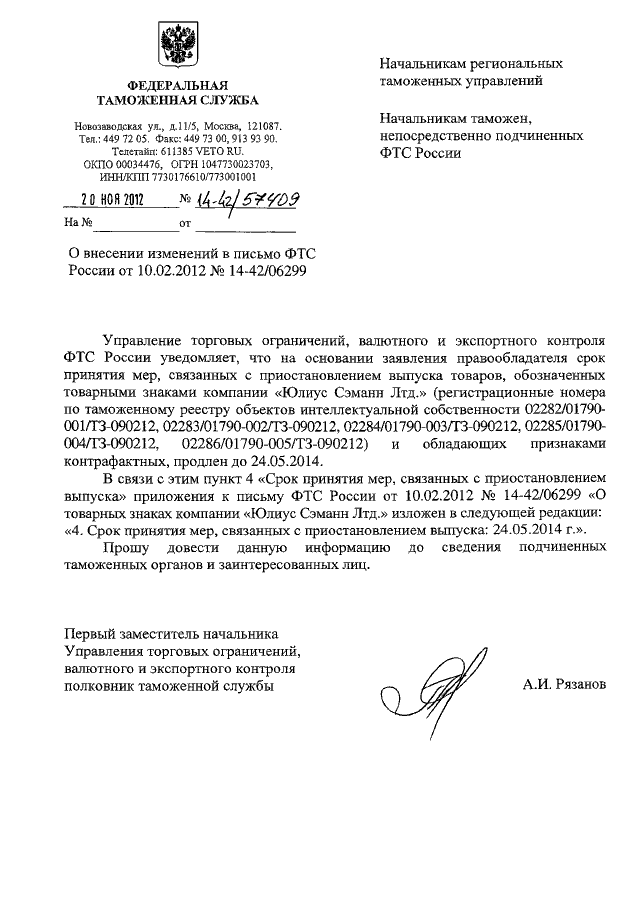 "О ВНЕСЕНИИ ИЗМЕНЕНИЙ В ПИСЬМО ФТС РОССИИ ОТ 10.02.2012 N 14-42/06299"