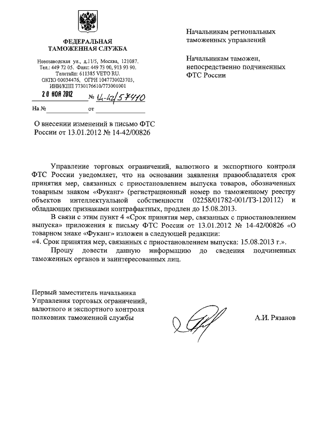 "О ВНЕСЕНИИ ИЗМЕНЕНИЙ В ПИСЬМО ФТС РОССИИ ОТ 13.01.2012 N 14-42/00826"