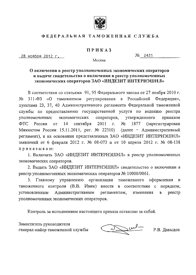 "О ВКЛЮЧЕНИИ В РЕЕСТР УПОЛНОМОЧЕННЫХ ЭКОНОМИЧЕСКИХ ОПЕРАТОРОВ И ВЫДАЧЕ СВИДЕТЕЛЬСТВА О ВКЛЮЧЕНИИ В РЕЕСТР УПОЛНОМОЧЕННЫХ ЭКОНОМИЧЕСКИХ ОПЕРАТОРОВ ЗАО "ИНДЕЗИТ ИНТЕРНЭШНЛ"