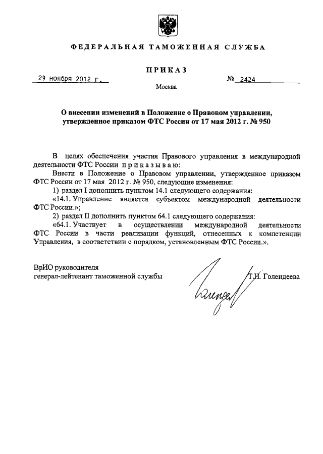 "О ВНЕСЕНИИ ИЗМЕНЕНИЙ В ПОЛОЖЕНИЕ О ПРАВОВОМ УПРАВЛЕНИИ, УТВЕРЖДЕННОЕ ПРИКАЗОМ ФТС РОССИИ ОТ 17 МАЯ 2012 Г. N 950"