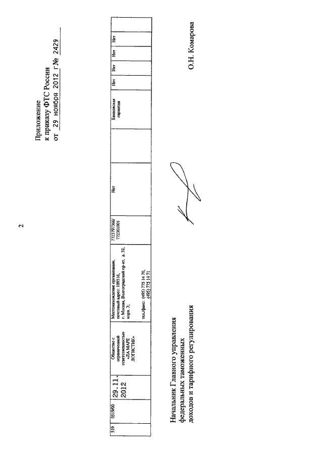 ПРИКАЗ ФТС РФ от 29.11.2012 N 2429
