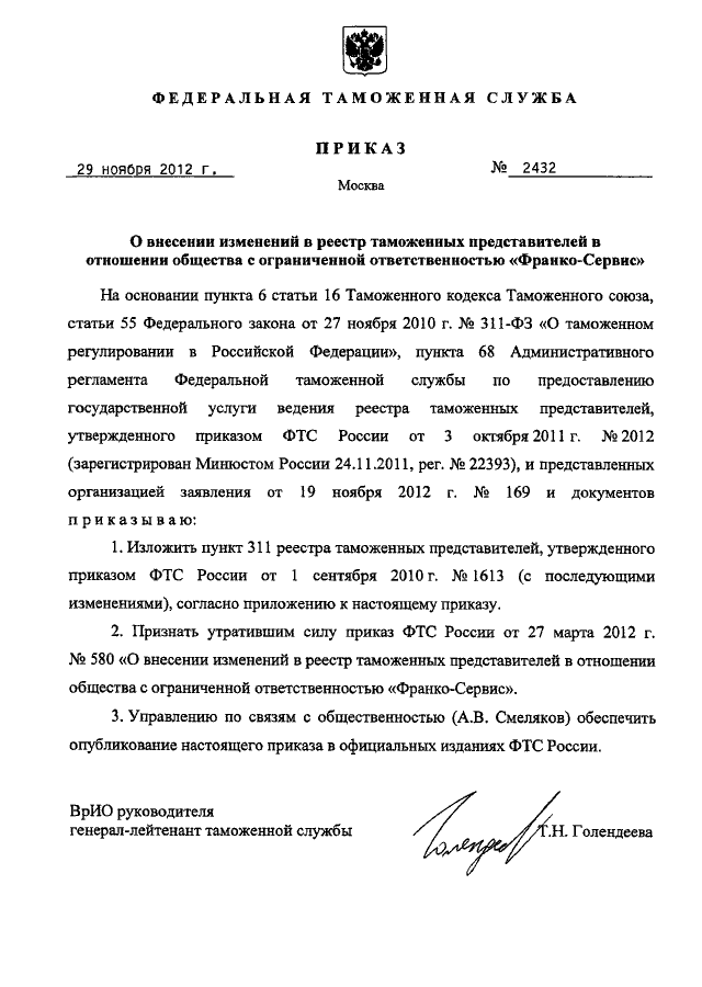 ПРИКАЗ ФТС РФ от 29.11.2012 N 2432