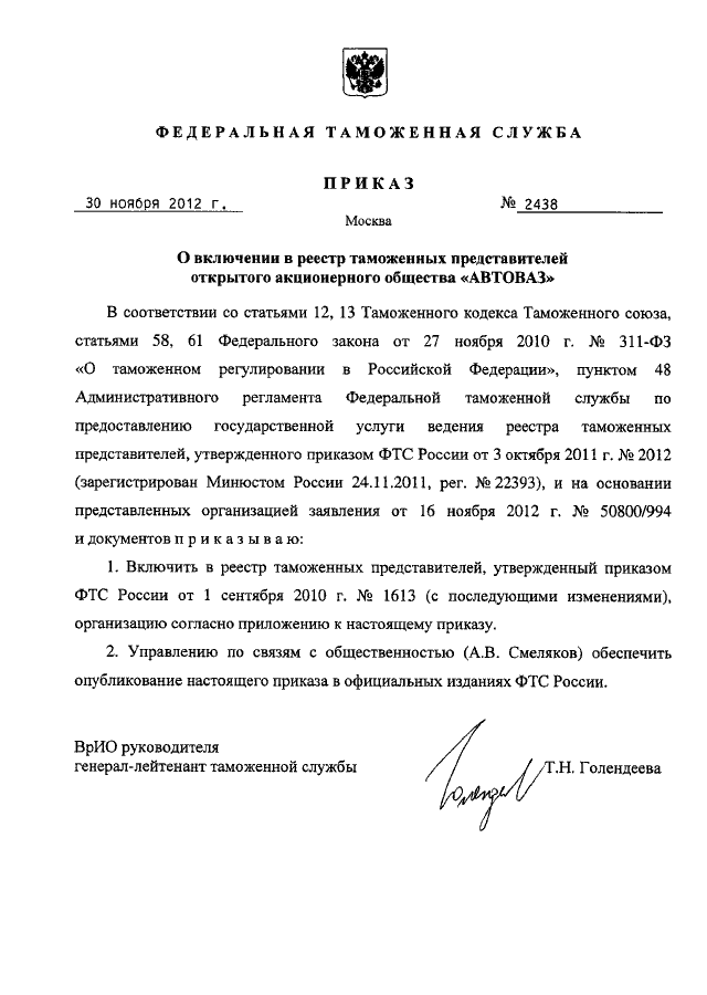 ПРИКАЗ ФТС РФ от 30.11.2012 N 2438