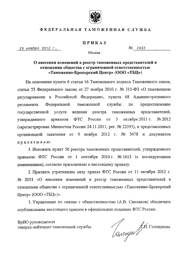 ПРИКАЗ ФТС РФ от 29.11.2012 N 2433