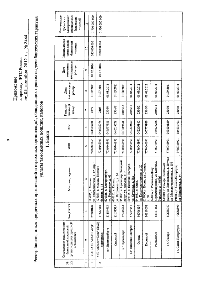 "ОБ УТВЕРЖДЕНИИ РЕЕСТРА БАНКОВ, ИНЫХ КРЕДИТНЫХ ОРГАНИЗАЦИЙ И СТРАХОВЫХ ОРГАНИЗАЦИЙ, ОБЛАДАЮЩИХ ПРАВОМ ВЫДАЧИ БАНКОВСКИХ ГАРАНТИЙ УПЛАТЫ ТАМОЖЕННЫХ ПОШЛИН, НАЛОГОВ"