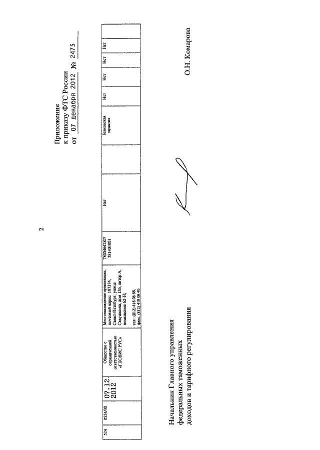 ПРИКАЗ ФТС РФ от 07.12.2012 N 2475