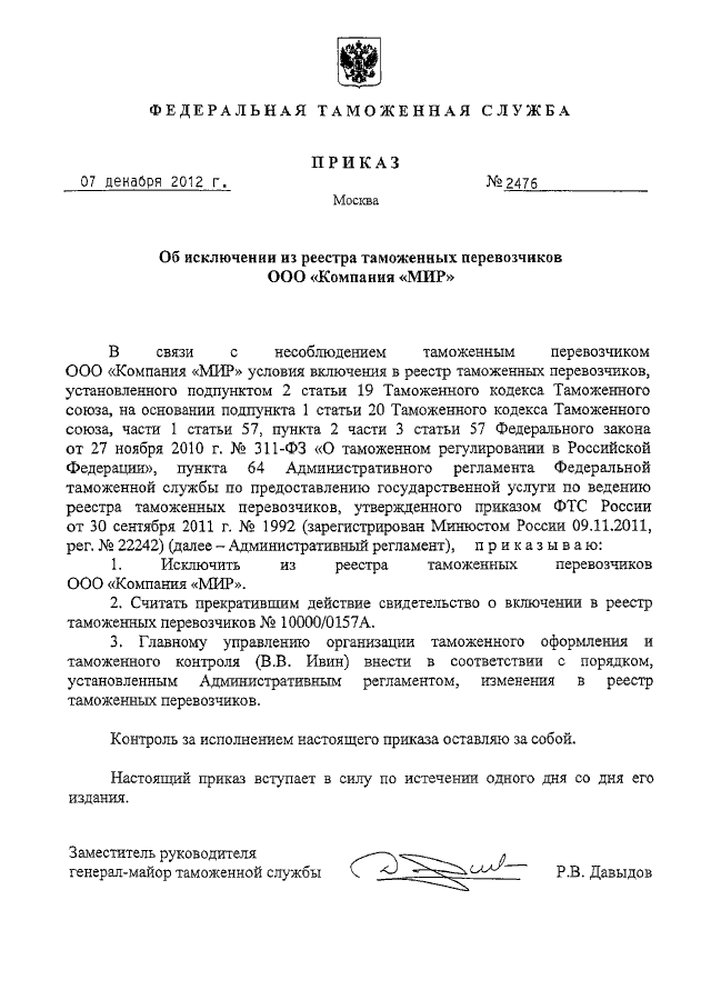 ПРИКАЗ ФТС РФ от 07.12.2012 N 2476
