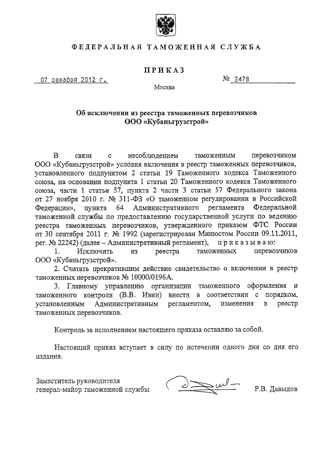 "ОБ ИСКЛЮЧЕНИИ ИЗ РЕЕСТРА ТАМОЖЕННЫХ ПЕРЕВОЗЧИКОВ ООО "КУБАНЬГРУЗСТРОЙ"